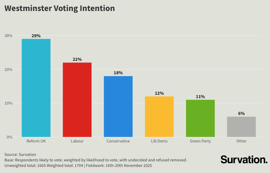Survation conducted an online poll of 2,082 adults aged 18+ in the UK on their voting intentions. Fieldwork was conducted between 16th–20th November 2025. Tables are available here.