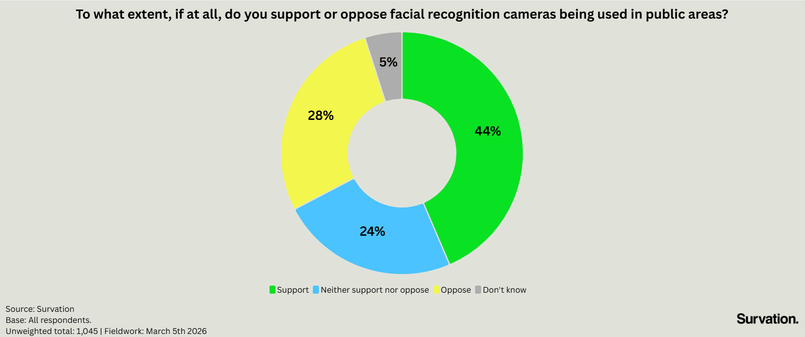 Survation conducted an online poll of 1,045 adults aged 18+ in the UK on their attitudes to the use of facial recognition by UK law enforcement. Fieldwork was conducted 5th March 2026. Tables are available here.