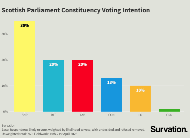 Survation conducted an online poll of 1,008 adults aged 16+ in Scotland on behalf of Ballot Box Scotland. Fieldwork was conducted between 14th-21st April 2026. Tables are available here.
